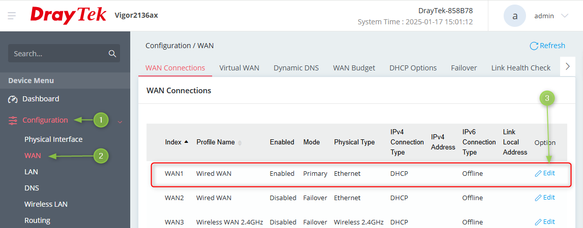 From the left-hand menu click Configuration then WAN. Click the Edit button to the right of WAN1.
