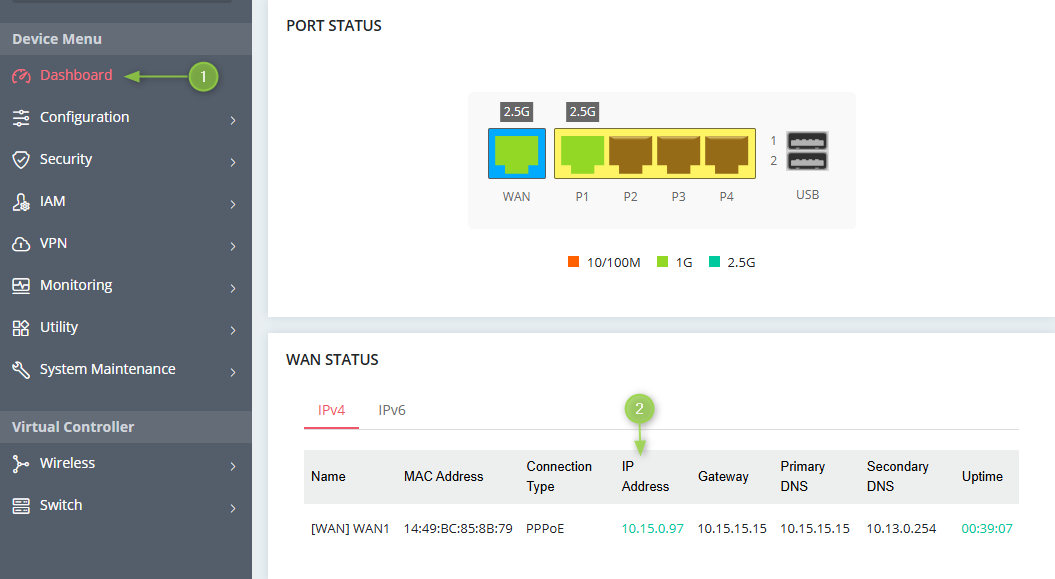 From the left-hand menu click Dashboard and check that WAN 1 Status shows a valid IP address. If there’s no IP displayed there is an error in your configuration. Check with your ISP the correct details and re-enter if needed.